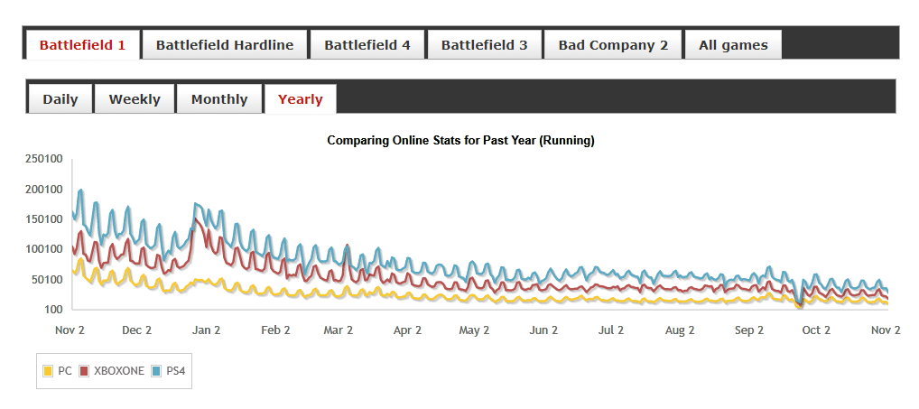 Battlefield 1 hat vor Kurzem sein einjähriges Jubiläum gefeiert. Ob die Zahlen wirklich einen Grund zur Feierlaune sind, ist jedem selbst überlassen. Der Abstieg vom Release bis hin zum heutigen Tag zeigt aber recht deutlich, dass bereits im Januar / Februar 2017 die Spieler sich anders orientiert haben. Seit Mitte April sind die Zahlen aber auf einem stabilen Niveau.