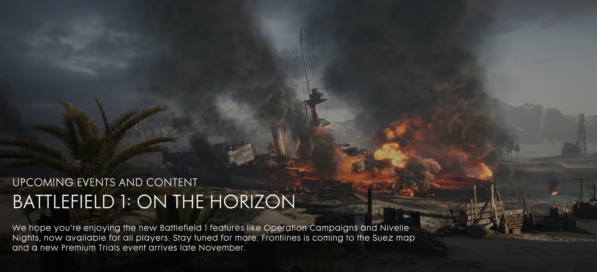Demnach wird das Update die Frontlines-Variante von Suez für alle Spieler kostenlos verfügbar machen und mit dem Update gleichezeitg auch wieder ein “Premium Trials” Event starten. Weiterhin stand für Ende November auch noch eine neue Operations Kampagne “Fall of Empires” im Raum. In der offiziellen Ankündigung ist davon aber keine Rede mehr.