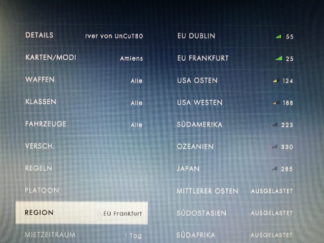 Ob es in Kürze auch offizielle Server von DICE am Standort “Deutschland / Frankfurt” geben wird, ist noch unklar. Aktuell bietet DICE diese Features nur für Serveradmins an, die einen Server über das Ingame Menü gemietet haben. Im Serverbrowser lassen sich derzeit noch keine offiziellen Battlefield 1 Gameserver aus Deutschland finden.