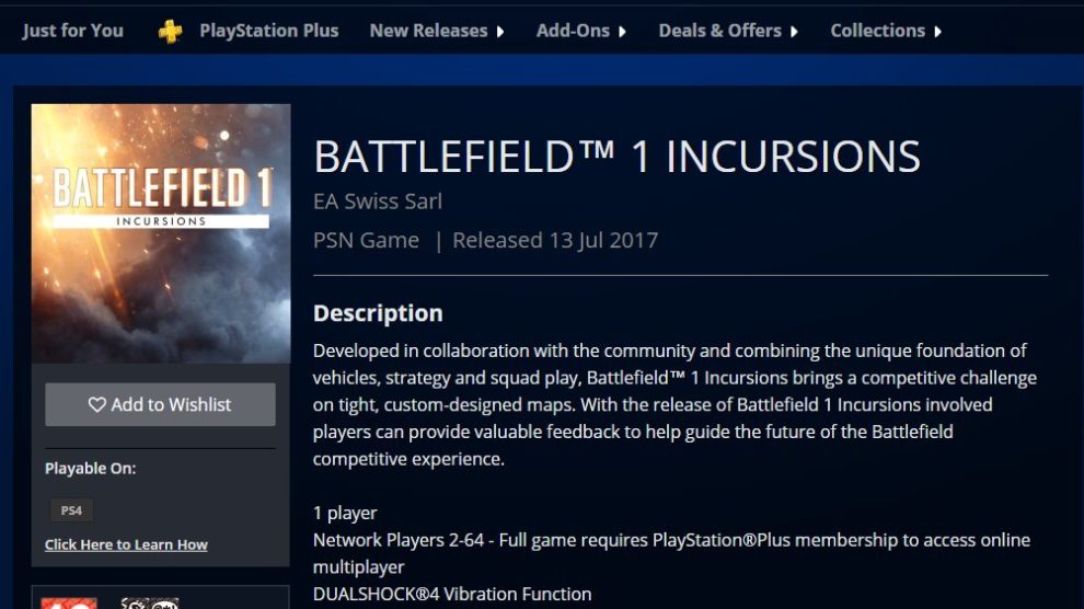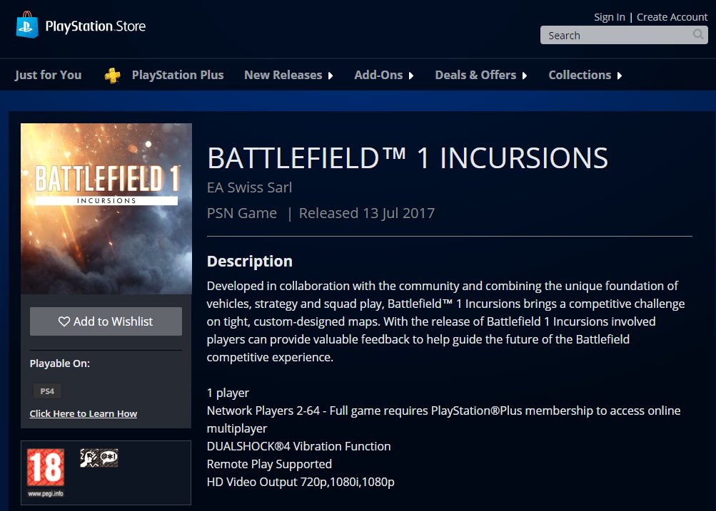 Ohne große Worte ist nun sowohl auf dem Xbox One Market Place als auch im Playstation 4 Store Battlefield 1 Incurisons aufgetaucht. Auf der Playstation 4 ist die Esport Version von Battlefield 1 bisher nur gelistet, Xbox One Spieler hingegen können Battlefield 1 Incursions bereits herunterladen.