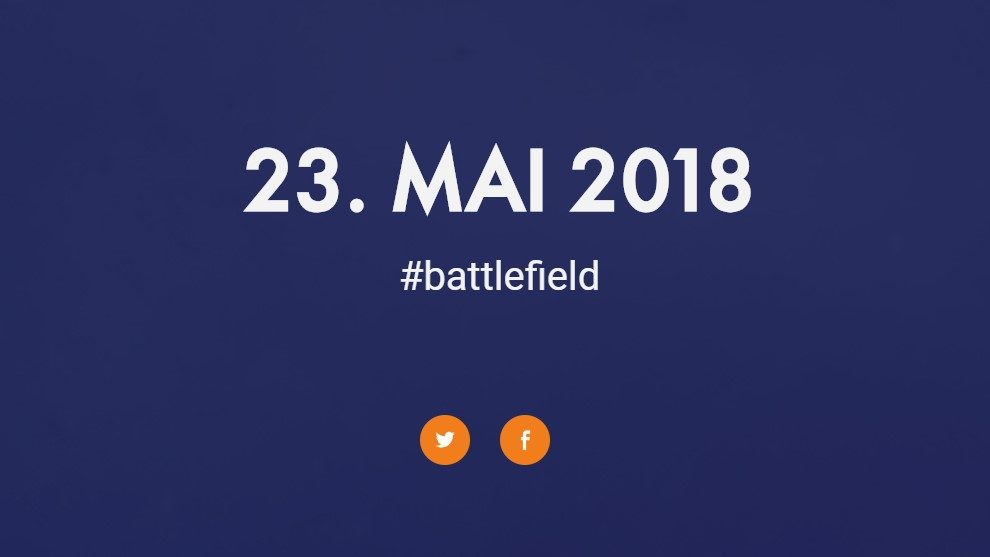 Hinter dem Link “https://www.ea.com/de-de/neverbethesame”, der auf eine offizielle EA Webseite zeigt, ist ein Datum zu sehen, welches der 23. Mai 2018 ist und das #battlefield sowie Links zu den sozialen Battlefield Kanälen enthält.