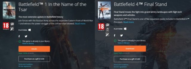 Im Angebot sind diesmal Battlefield 1 “In the Name of the Tsar” & “Battlefield 4 Final Stand“.