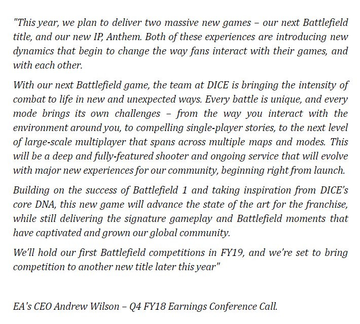 Zusammengefasst erklärt Wilson den Investoren dann, dass das nächste Battlefield, welches im Oktober 2018 erscheinen wird, über fesselnde Singleplayer-Geschichten und einen riesigen Multiplayer des nächsten Levels, der sich über mehrere Maps und Modi hinwegspannt, definieren wird.