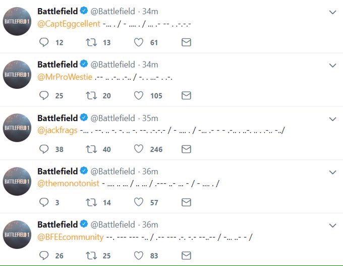 Der offizielle Battlefield Twitter Kanal hat kürzlich Morse Codes an verschiedene Influencer geschickt. Mit dabei JackFrags, Westie, die Battlefield Easter Egg Community und weitere.