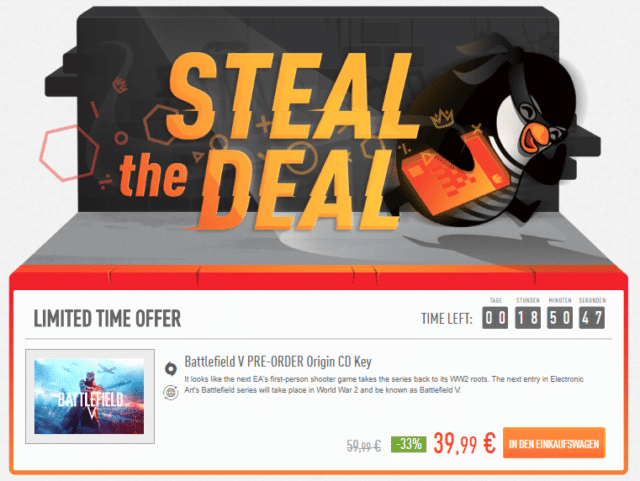 Bitte beachtet, dass es sich bei dieser Version lediglich um das Hauptspiel handelt. Ggf. sind Pre-Order Boni nicht Bestandteil des Angebots. Dafür ist es aber extrem günstig. Da ihr den Key erst am Releasetag erhaltet, werdet ihr ebenfalls keinen Vorabzugang zur offenen Beta von Battlefield V erhalten und könnt erst zum Start der offenen Beta an dieser teilnehmen. Das Angebot ist bis zum 25. Mai 2018 / 11:00 Uhr gültig.