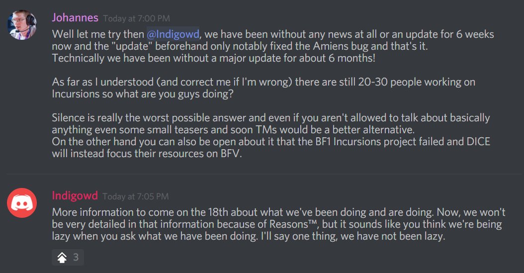 Via Discord wurde nun bekannt, dass es aber trotz allem bald Neuigkeiten geben wird. Dies schrieb Jojje Dalunde aka Indigowd im Battlefield Incursions Discord Kanal. Konkret heißt es, dass es am 18. Juni 2018 neue Informationen geben soll, die man bisher nicht ohne Grund zurückgehalten hat und stellt klar, dass man weiter mit vielen Ressourcen an dem Projekt arbeitet.