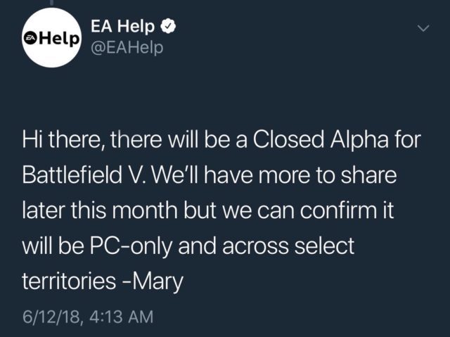 Der Tweet von EA Help macht nun starke Hoffnung, denn vor wenigen Minuten wurde bekannt, dass Battlefield V eine Closed Alpha erhalten wird und dadurch einige Spieler in den frühen Genuss von Battlefield V kommen werden. Laut EA wird die Closed Alpha allerdings nur auf dem PC stattfinden und auch nicht in allen Ländern. Weitere Details zur Closed Alpha, in der Aufnahmen jeglicher Art und Streaming wie immer strikt verboten sind, werden im Laufe des Monats bekanntgegeben.