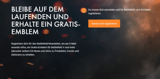 Es ist soweit! Die PR Maschinerie für Battlefield V ist auf Hochtouren und wie zu Battlefield 1 gibt es auch für Battlefield V ein Special. Diesmal ist es aber kein Game-Keys für eine Closed Alpha, die unter allen Abonnenten verteilt wird, sondern ein gratis Emblem für Battlefield V, das ihr neben den normalen News und Infos erhaltet. Wie das Emblem aussieht, ist nicht bekannt.
