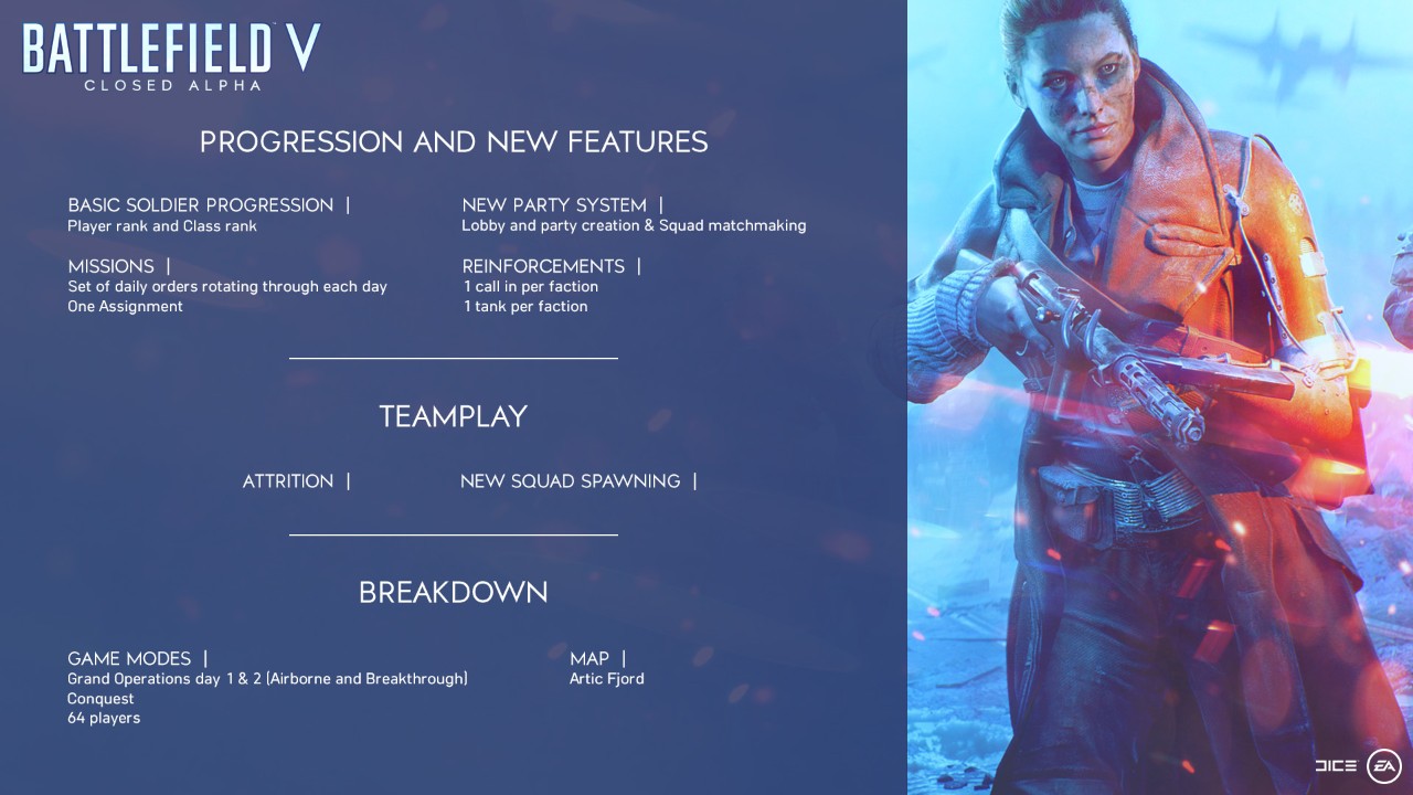 DICE hat nun Informationen zu all diesen Themen bekanntgeben. Demnach wird die zweite Battlefield V Closed Alpha die selben Inhalte haben wie auch die erste Closed Alpha. An dem Build von Battlefield V wurde nahezu nichts geändert und demnach sind auch alle Inhalte wie die Map (Arctic Fjord), die Spielmodi (Conquest & Grand Operation), die Klassen, sowie Fehler und Bugs identisch mit denen aus der ersten Closed Alpha.