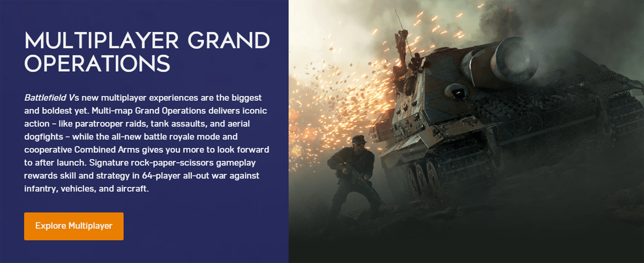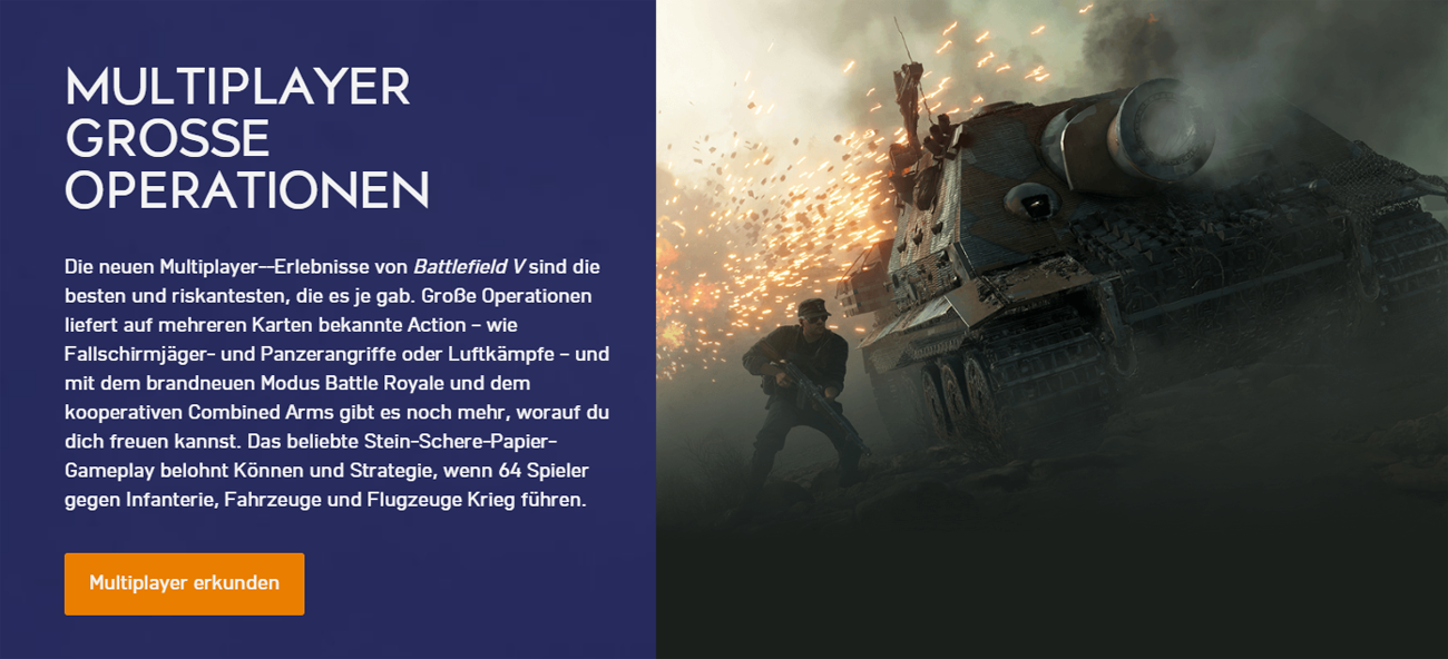 Ob es sich dabei um einen Fehler handelt, ist nicht bekannt. Auf der deutschen Battlefield Webseite ließt sich das Ganze völlig anders. Denn dort steht kurioserweise weder etwas davon, dass der Battle Royale Spielmodus später erscheint, noch dass der Coop Spielmodus Combined Arms nicht zum Release in Battlefield V enthalten sein wird.