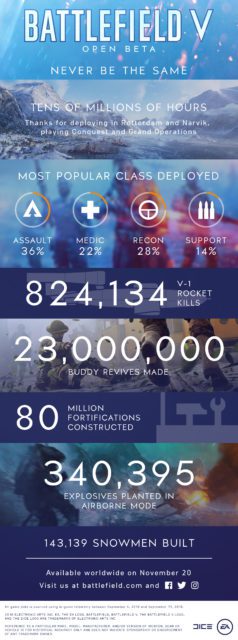 Demnach wurden in mehreren Millionen Spielstunden über 800.000 V1 Raketen Kills erzielt, 23 Millionen Teamkameraden wiederbelebt, knapp 341.000 Sprengladungen im Grand Operations Spielmodus gelegt, 80 Millionen Fortifications gebaut und etwas mehr als 143.000 Schneemänner auf der Map Narvik von euch aufgestellt.
