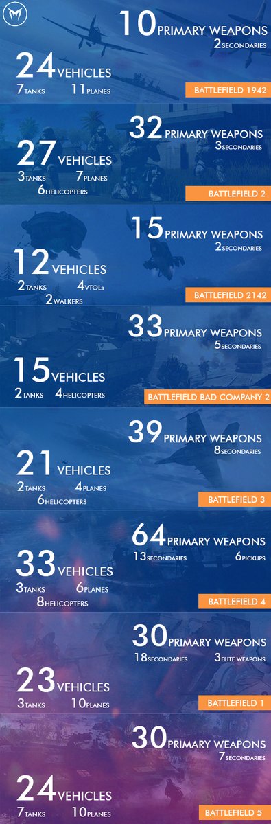Via Twitter sind wir auf ein Bild gestoßen, welches ziemlich deutlich zeigt, dass DICE uns in der Vergangenheit und speziell in Battlefield 4 einfach sehr stark verwöhnt hat. Battlefield 4 hatte nämlich 64 Primär Waffen, viele Fahrzeuge und ist für viele Spieler wohl auch der Maßstab der Dinge, da Battlefield Hardline sowie Battlefield 1 einfach nicht aktiv mit dabei waren. Der Vergleich zeigt in jedem Fall, dass Battlefield V im Vergleich zu allen anderen Battlefield Titeln richtig gut dabei ist und nicht deutlich mehr oder weniger Waffen und Fahrzeuge besitzt.