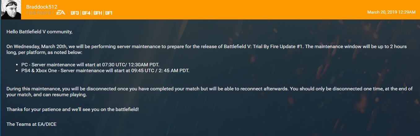 Recht spontan und ohne viel Vorlauf hat DICE in den heutigen frühen Morgenstunden Wartungarbeiten am Battlefield V Backend vorgenommen. Die Wartungsarbeiten fanden statt, um Vorbereitungen für das seit gestern zertifizierte Trial By Fire Update #1, sprich das nächste Client Update für Battlefield V, vorzubereiten. Die Wartungsarbeiten fanden dabei für PC Spieler von 08:30 Uhr bis 10:30 Uhr deutscher Zeit statt und für Konsolen Spieler von 10:45 Uhr bis 12:45 Uhr.