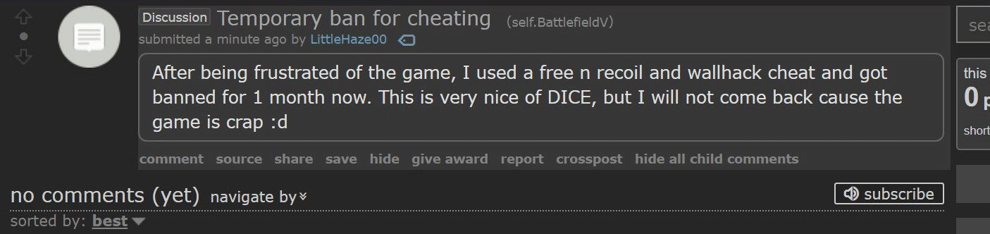 DICE beteuert zwar, dass man solche Spieler regelmäßig vom Spiel entfernt, hat aber bisher nichts zu den disziplinarischen Maßnahmen gesagt, die Spieler befürchten müssen, sobald diese erwischt werden. Ausprobieren wollen wir die volle Härte von DICE allerdings nicht und waren daher stark überrascht als wir über einen mittlerweile von einem Moderator zensierten Beitrag bei Reddit gestolpert sind.