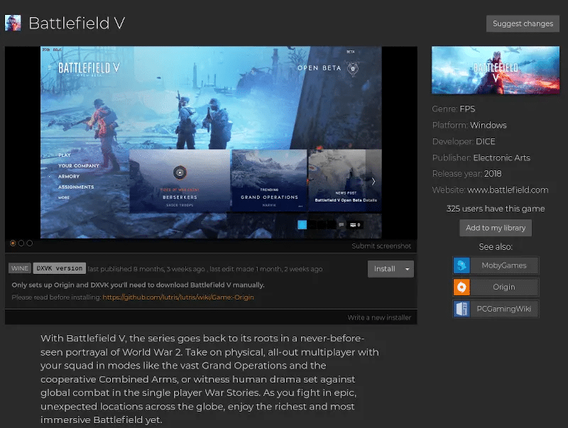 Um möglichst wenig Probleme zu haben, gibt es die Linux Distribution “Lutris”, mit der alle Voraussetzungen erfüllt sind, um Spiele online oder auch im Singleplayer zu spielen. Offiziell, so geben die Entwickler der Lutris Distribuon an, wird Battlefield V bis Heute über Origin unterstützt.