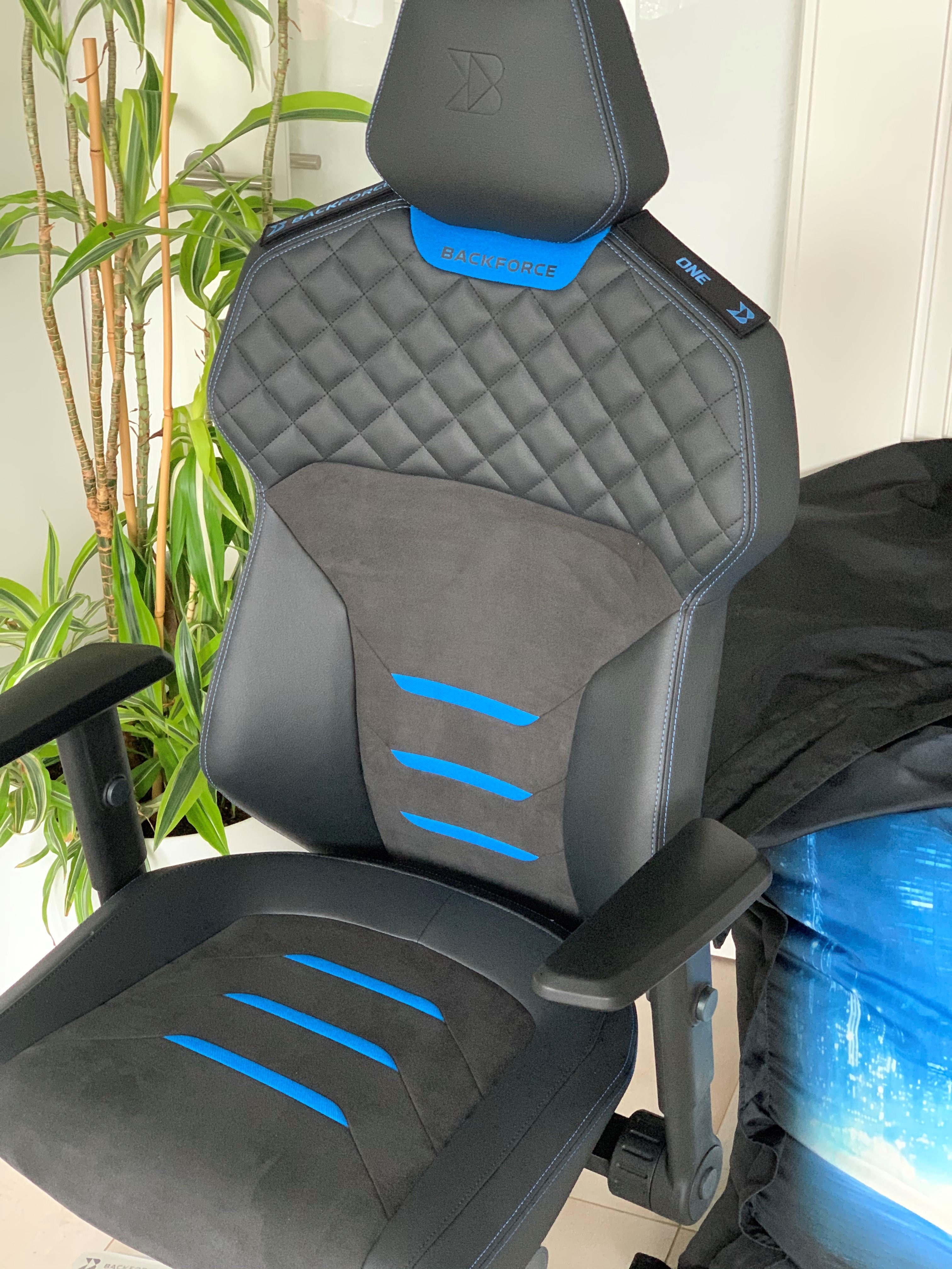 Beim Backforce One ist durch den generellen Aufbau des Stuhl bereits eine im Vergleich qualitativere Bauart ausgewählt worden. Die Art der Polsterung deutet ebenfalls darauf hin, dass gute, formstabile und langlebige Materialien verwendet worden sind. Als Überzug kommt eine Kunstleder -/Alcantara Mischung zum Einsatz. Sitzfläche und Rückenpolster bestehen dabei aus angenehm zarten Alcantara und die Seiten und Kopfstütze aus Kunstleder.