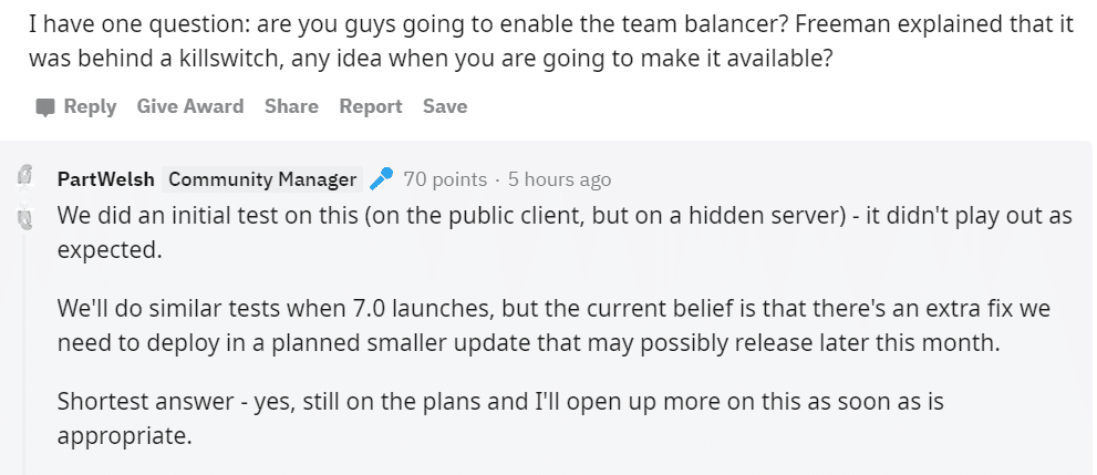 Die gute Nachricht ist wohl, dass DICE an dem Thema Auto-Teambalancer für Battlefield V arbeitet. Die schlechte Nachricht ist, dass man seitens der Entwicler nicht mit dem aktuellen Stand zufrieden ist. Laut Community Manager PartWelsh will man nach der Veröffentlichung des Summer Updates,l weiter an dem Auto-Teambalancer arbeiten und diesen, sofern alles gut läuft, noch diesen Monat nachreichen.