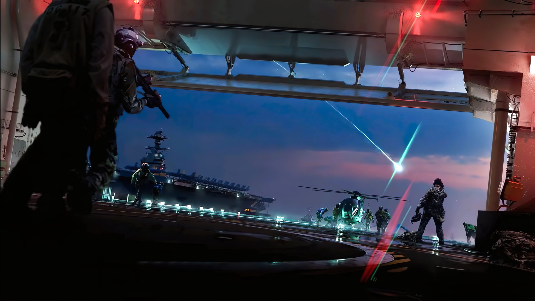 - Es gibt ein erstes Bild aus dem Hazard Spielmodus. Der Spielmodus wird als Squad-basierter Spieltyp beschrieben, bei dem es um alles geht was die Battlefield-Reihe in einen modernen Ansatz des Multiplayer-Gamings zu bieten hat. Der Spielmodus soll zwar typisch für DICE sein, sich aber völlig anders als Eroberung oder Durchbruch spielen und auch kein Battle Royale Spielmodus sein. Auf dem Bild selbst ist ein Hangar zu sehen, auf dem sich offenbar ein Squad aus Soldaten bereit für den Abflug macht und Ausrüstung zu einem Helikopter bringt. Der Name Hazard Zone bzw. Gefahrenzone lässt vermuten, dass dein Trupp in eine Art Gefahrenzone geworfen wird und dort eine riskante Mission zu erfüllen muss. Naturkatastrophen könnten hier eine entscheidende Rolle spielen.