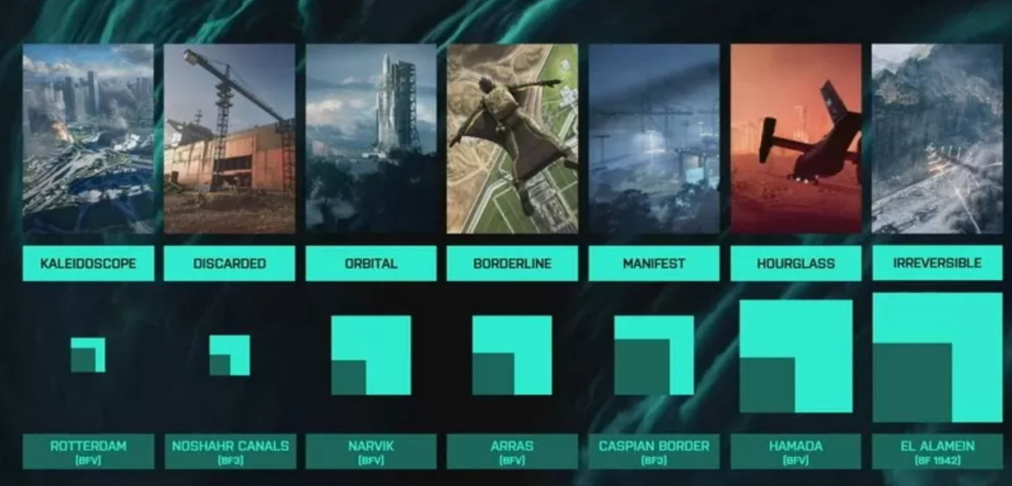 - Breakaway ist zum Release die größte Karte im Spiel und gleichzeitig auch der Battlefield Geschichte. DICE hat ein Schaubild veröffentlicht, auf dem die Größen der sieben zum Release von Battlefield 2042 verfügbaren Maps mit anderen bekannten Maps aus der Battlefield Geschichte verglichen werden. Bitte beachtet, dass DICE auf dem Schaubild auch interne Entwicklungsnamen verwendet hat. Borderline ist entsprechend die Karte Renewal / Neuanfang und Irreversible bildet die Karte Breakaway bzw. Umbruch ab. Mehr zu den sieben Battlefield 2042 Maps erfahrt ihr hier.