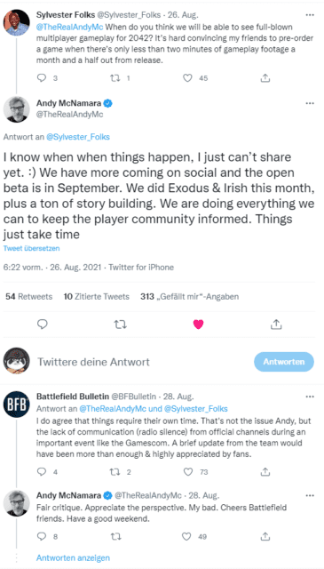 Auf die Kritik zur verpassten Chance auf der Gamescom die Battlefield Community mit neuen Informationen, Bildern oder sogar einem Video abzuholen, reagiert McNamara ebenso und sieht es nur als fair an, diese Art von Kritik zu äußern.