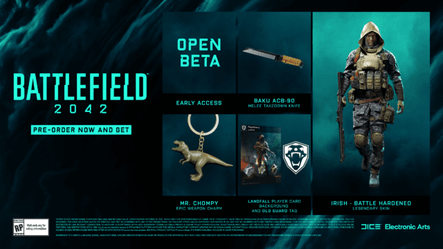 Wer Battlefield 2042 vorbestellt, erhält den exklusiven legendären Skin „Irish – Kampfgestählt“ für Irish als spielbaren Spezialisten sowie Vorabzugang zur Open Beta, das epische Nahkampfmesser Baku ACB-90, den epischen Waffen-Talisman „Mr. Chompy“ sowie den Spielerkarten-Hintergrund „Landung“ und die Erkennungsmarke „Alte Wache“.