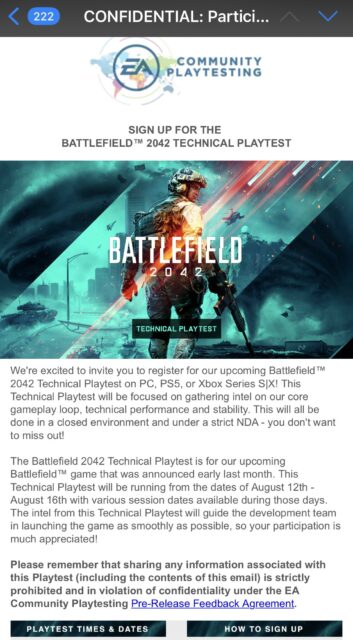 Da der Battlefield 2042 Technical Playtest lediglich über eine offizielle Einladung von EA und DICE möglich ist, solltet ihr eure E-Mail-Postfächer am besten einmal prüfen. Eventuell gehörst ja genau du zu den glücklichen Spielern, die EA ausgewählt hat, um Battlefield 2042 zusammen mit wenigen anderen Spielern zu testen.