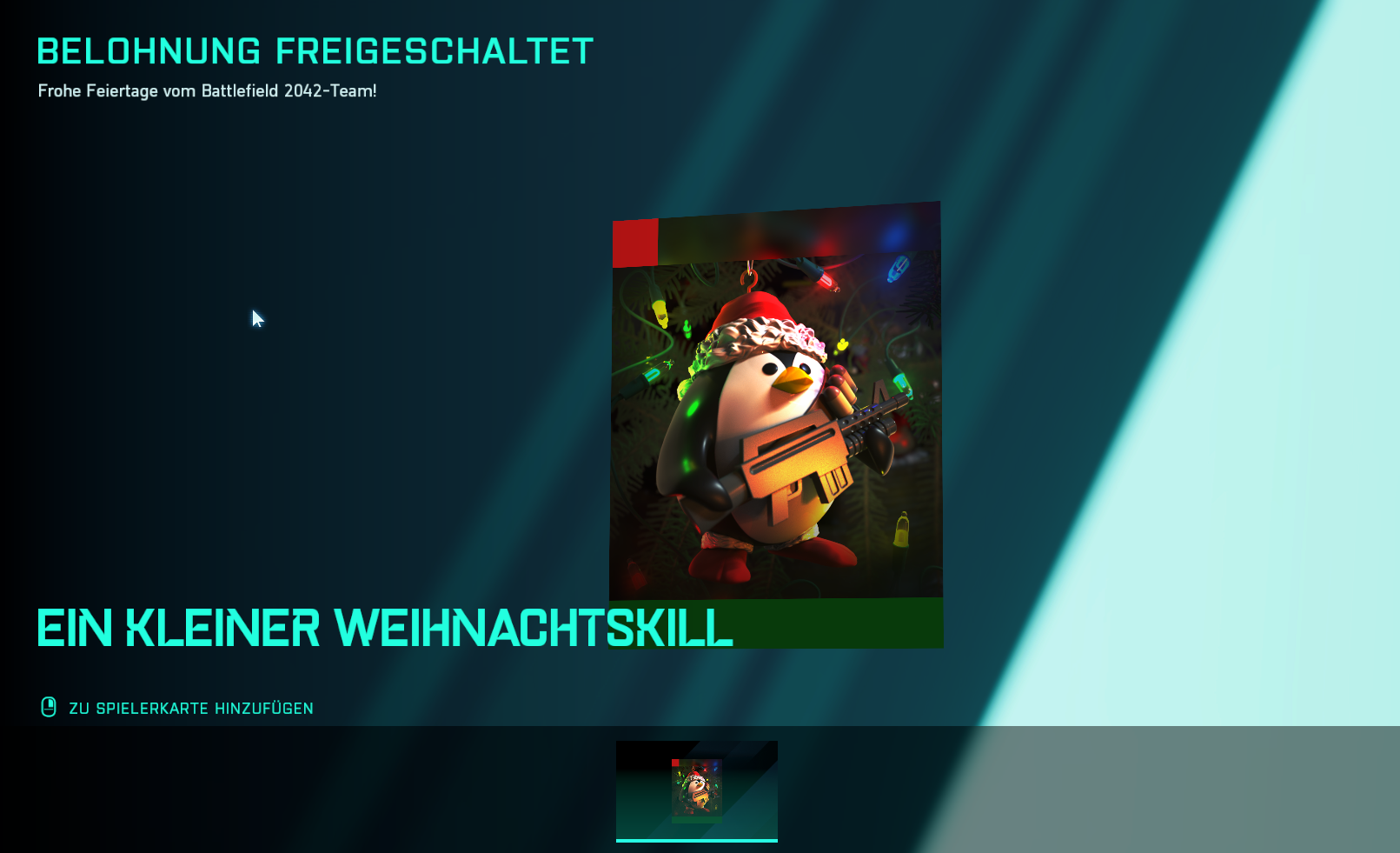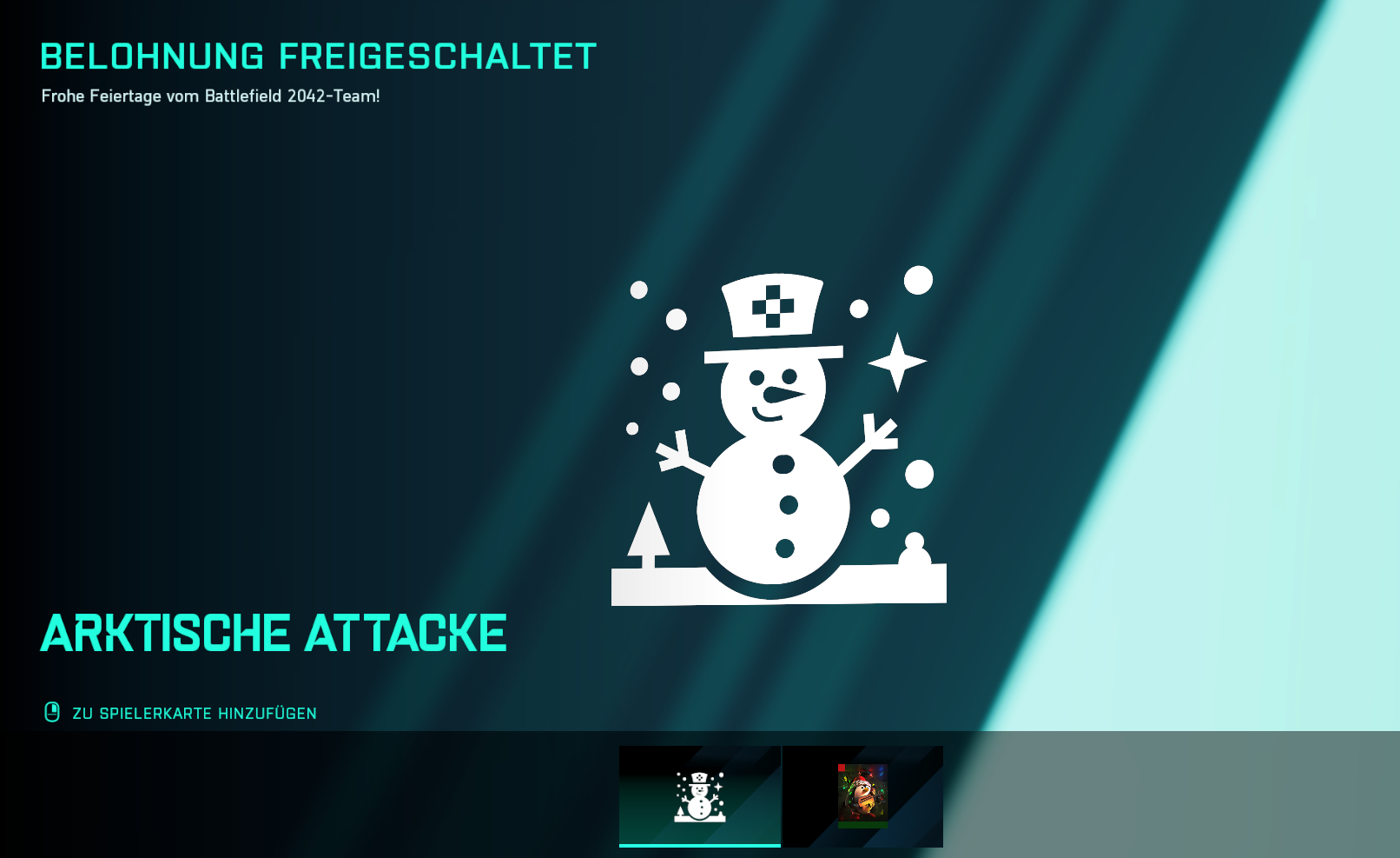 Spieler, welche sich aktuell in Battlefield 2042 anmelden, erhalten einen kostenlosen Weihnachtsgruß der Entwickler von DICE. Konkret erhaltet ihr für den Login die “Ein kleiner Weichnachtskill” Playercard und einen “Arktische Attacke” Tag für eure Playercard. Die Skins können bis zum 23. Dezember 2021 abgeholt werden.
