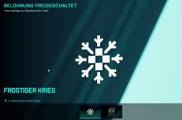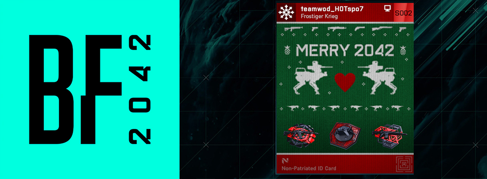 Nachdem es bereits in den letzten zwei Wochen ein Login-Event gab, welches heute endete, legt DICE nun nochmal nach und verschenkt an alle Spieler, die sich aktuell in Battlefield 2042 anmelden, einen weiteren kostenlosen Weihnachtsgruß. Konkret erhaltet ihr für den Login die “Fröhliches Chaos” Playercard und einen “Frostiger Krieg” Tag für eure Playercard.