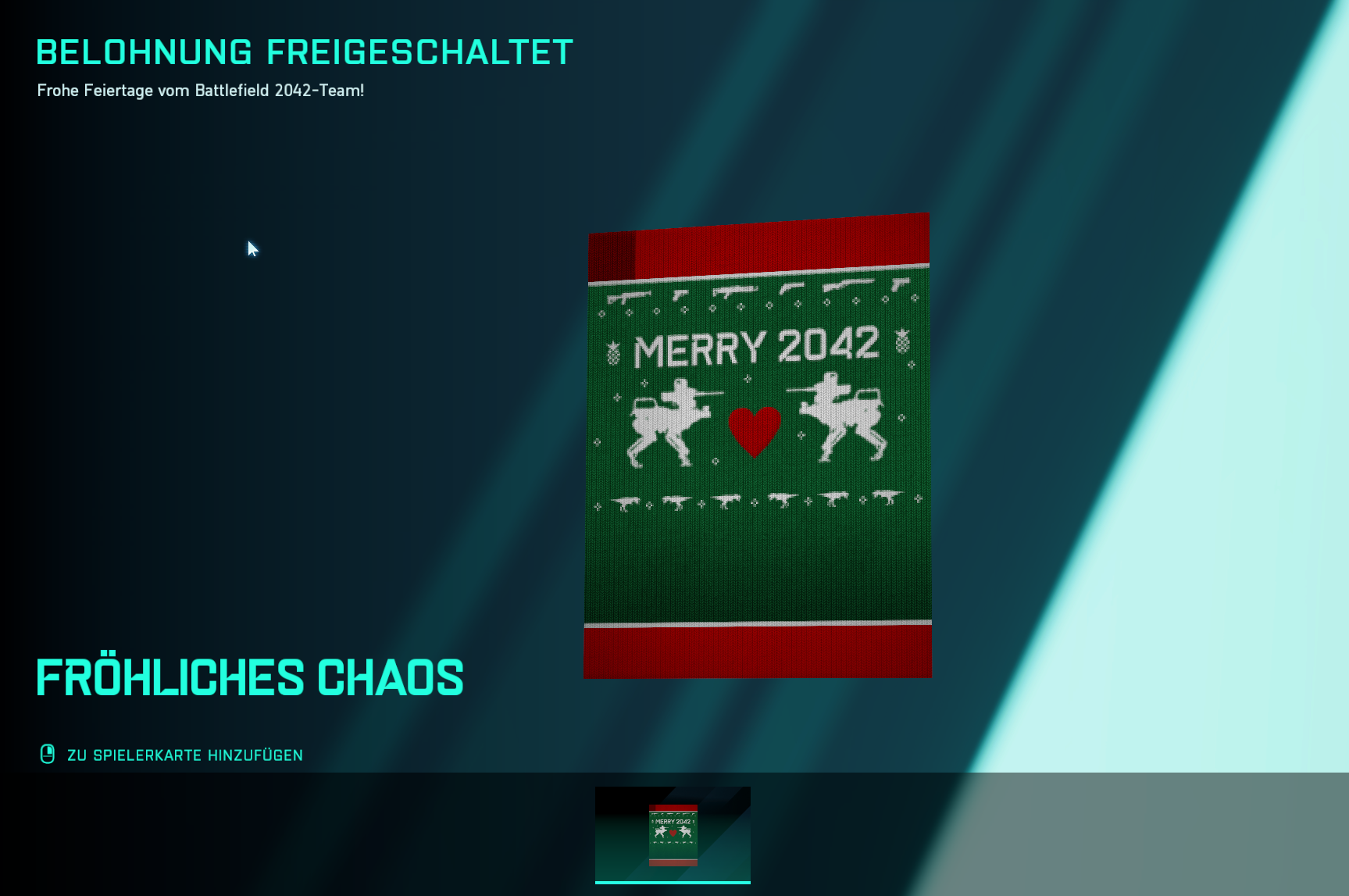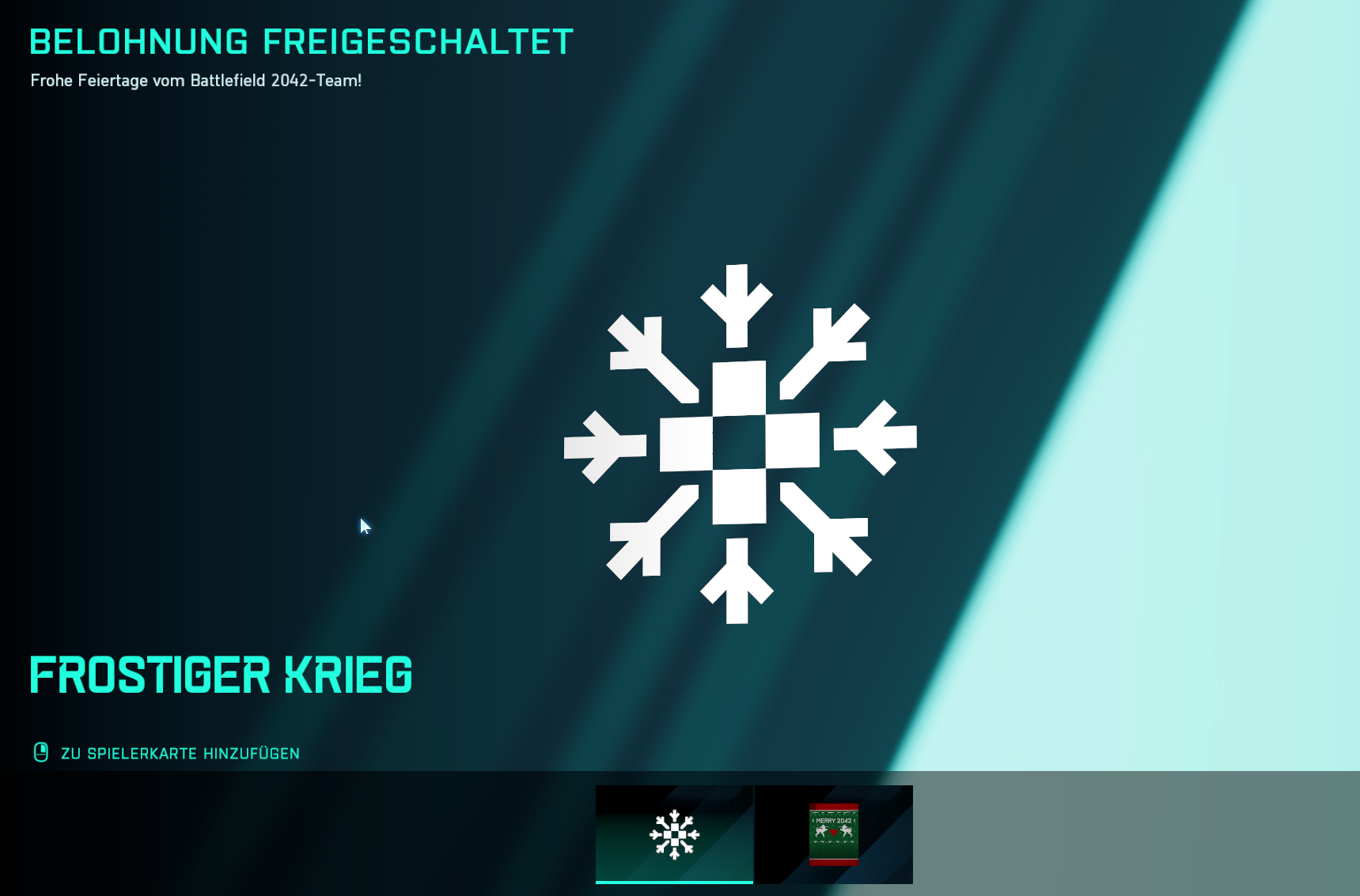 Nachdem es bereits in den letzten zwei Wochen ein Login-Event gab, welches heute endete, legt DICE nun nochmal nach und verschenkt an alle Spieler, die sich aktuell in Battlefield 2042 anmelden, einen weiteren kostenlosen Weihnachtsgruß. Konkret erhaltet ihr für den Login die “Fröhliches Chaos” Playercard und einen “Frostiger Krieg” Tag für eure Playercard.