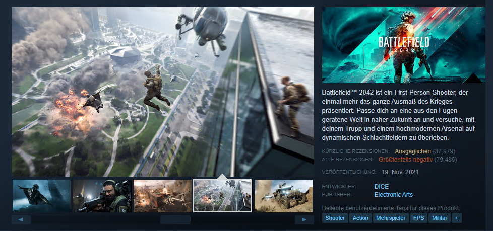 Seit dem Release von Battlefield 2042 ist es so, dass sich vor allem die Spielerbewertungen zum Spiel sehr tief ansiedeln. Letztlich gibt es dafür genügend Gründe und die müssen hier nicht nochmal alle einzeln afugeführt werden. Neben den Bewertungen auf den verschiedenen Portalen im Internet, sind aber auch die Bewertungen auf der Steam Plattform inzwischen sehr entscheidend darüber, ob ein Spiel ein Erfolg oder eine katastrophale Niederlage wird. Bei einem Titel wie Battlefield 2042 wundert es zudem nicht, dass inzwischen über 79.000 Spielerbewertungen alleine über Steam eingegangen sind, die erwartungsgemäß größtenteils negativ ausfallen.