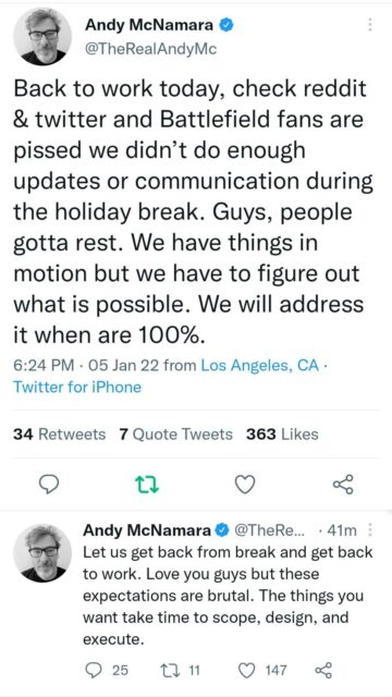 Vermutlich konnte Lehto seinen Augen nicht trauen als die überwiegend positiven Worte und Resonanz auf einmal kippten als sein Kollege Andy McNamara den Spieß umdrehte und ebenfalls auf Twitter wütende Fans und Influcener auf sich aufmerksam machte als er die Erwartungen der Spieler an das Team bei DICE als “brutal” bezeichnete.