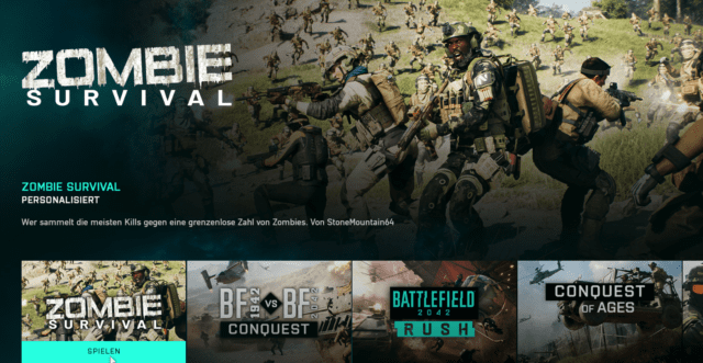 Der Spielmodus hört auf den Namen “Zombie Survival” und wurde ursprünglich von “StoneMountain64” über den Portal Editor gebaut. In dem Spielmodus tretet ihr im 4er Squad gegen via Fallschirm landende AI gesteuerte Zombie Soldaten Horden an. Ziel ist es in diesem Spielmodus so viele Zombies zu töten wie nur möglich. Solltet ihr sterben, kann euch euer Squad gegen Zombie Kills wieder auf´s Schlachtfeld rufen. Gespielt wird auf allen Karten aus Battlefield 1942, BC2, BF3 und 2042.