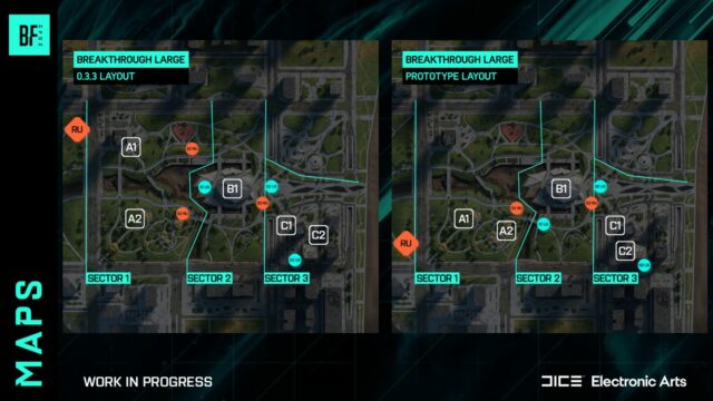 Das bedeutet auch, dass wir eine mögliche Reduzierung der Anzahl der Sektoren und der gesamten Eroberungspunkte pro Karte prüfen, wenn mit 128 Spielern gespielt wird. Wir denken auch darüber nach, die Form der Karten zu ändern, um euch mehr Orientierung zu geben. Wir glauben, dass der Wechsel von einem üblichen Battlefield-Standard eines quadratischen Spielbereichs zu einer rechteckigen Form, die am häufigsten in einigen der älteren Titel verwendet wurde, einen besseren Anreiz bieten kann vorwärts zu drängen, anstatt seitwärts zu kreisen. Wir sind außerdem der Meinung, dass dies dazu beitragen kann Kampfbereiche zu fokussieren, euch ein fokussierteres Bewusstsein zu geben und die Möglichkeit zu verringern, dass feindliches Feuer von überall um euch herum eindringt.