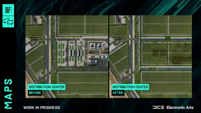 Auf der Map Renewal wird es dann aber schon abenteuerlicher. Denn hier gibt es neben einigen guten Änderungen, die für mehr Deckung sorgen, auch eine sehr fragwürdige Änderung. Denn schaut man sich die Bilder genauer an, so fällt auf, dass DICE aktuell wohl plant das Distribution Center zu entfernen und durch eine grüne Wiese zu ersetzen. Dabei hat Battlefield 2042 genau das Problem, dass Kämpfe oftmals auf freier Fläche stattfinden müssen, da nicht genug Vegetation, Häuser oder Landschaft das Gebiet ansprechend gestellten. Ggf. handelt es sich aber auch nur um ein Platzhalter, der die neuen Wege zeigen soll, denn das Bild stammt aus der Textpassage, in der es allgemein um neue Laufwege geht.