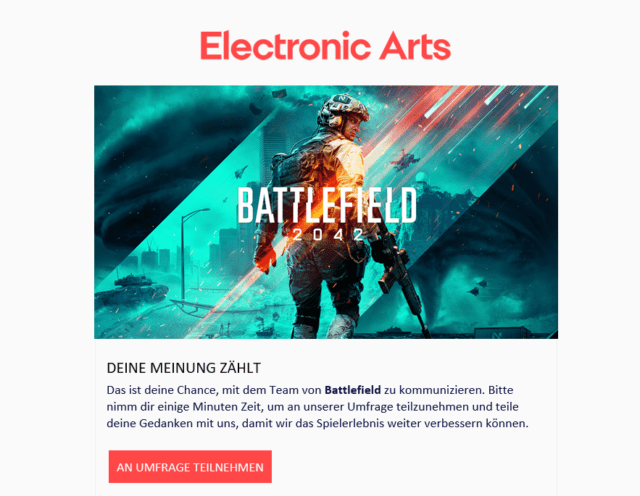 Prüft auf jeden Fall euren Posteingang und nehmt euch etwas Zeit die Fragen zu beantworten. Die E-Mail hat den Betreff: Battlefield 2042 will dein Feedback und sieht wie folgt aus: