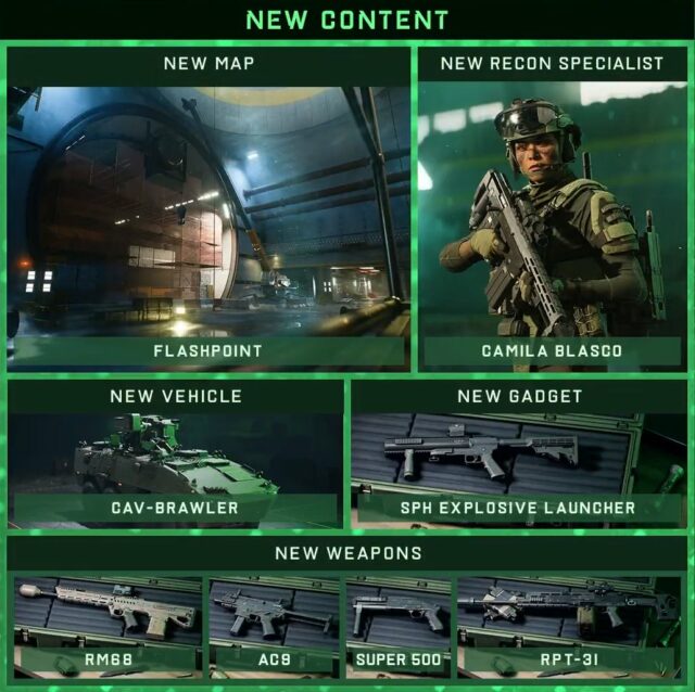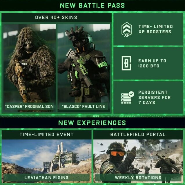 Darunter eine neue Karte, eine Spezialistin, Waffen, ein Fahrzeug, 100 neue Battle-Pass-Ränge und vieles mehr. Alle Inhalte werden allen Spielern im Rahmen des kostenlosen Rangs des Battle Pass von Battlefield 2042 zur Verfügung stehen. Weitere kosmetische Objekte sind über die Premium-Version des Battle Pass erhältlich.