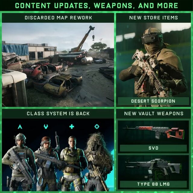 Im Verlauf der vierten Season wartet die überarbeitete Version der Karte “Ausrangiert” auf alle Spieler, welche mit verbesserten Sichtlinien und mehr Sichtbarkeit, vielfältiger Deckung für verbesserte Infanteriegefechte, besseren Kontrollpunkten, neuen Bereiche auf der Karte eine bessere Spieldynamic bietet. Weitere Details zu der Überarbeitung folgen im nächsten Entwicklerupdate.