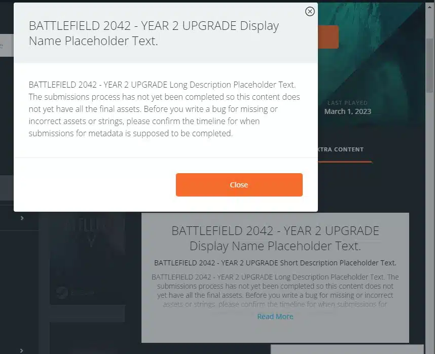 Das Resultat ist, dass das Angebot “BATTLEFIELD 2042 – YEAR 2 UPGRADE – PC – WW” sowohl auf Steam als auch auf Origin zu finden ist. Die Tatsache, dass das Upgrade Paket 2 Euro kosten soll, das „storeStartDate“ auf den 01. März 2023 eingestellt ist, deutet und auf einen Platzhalter hin.