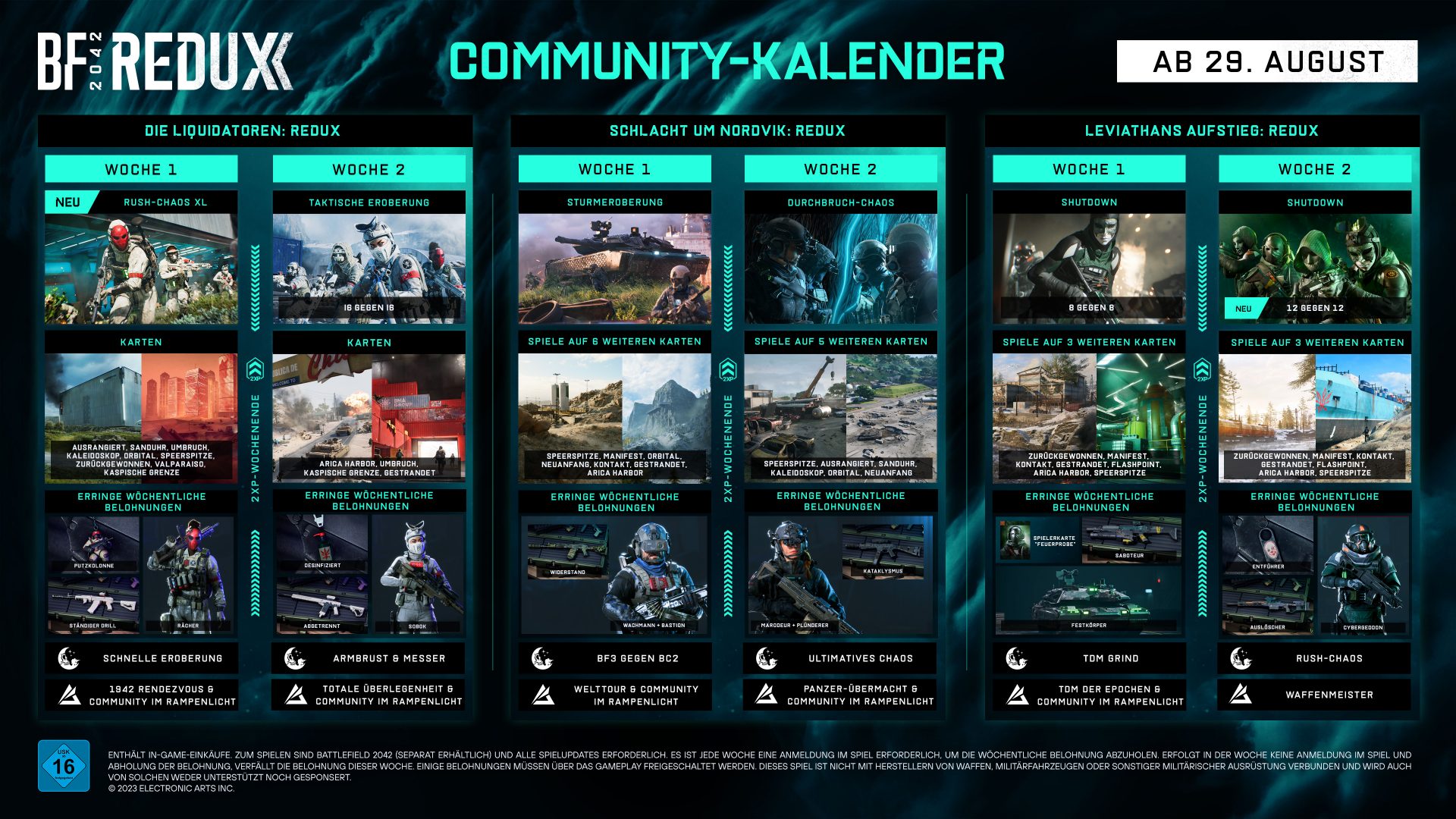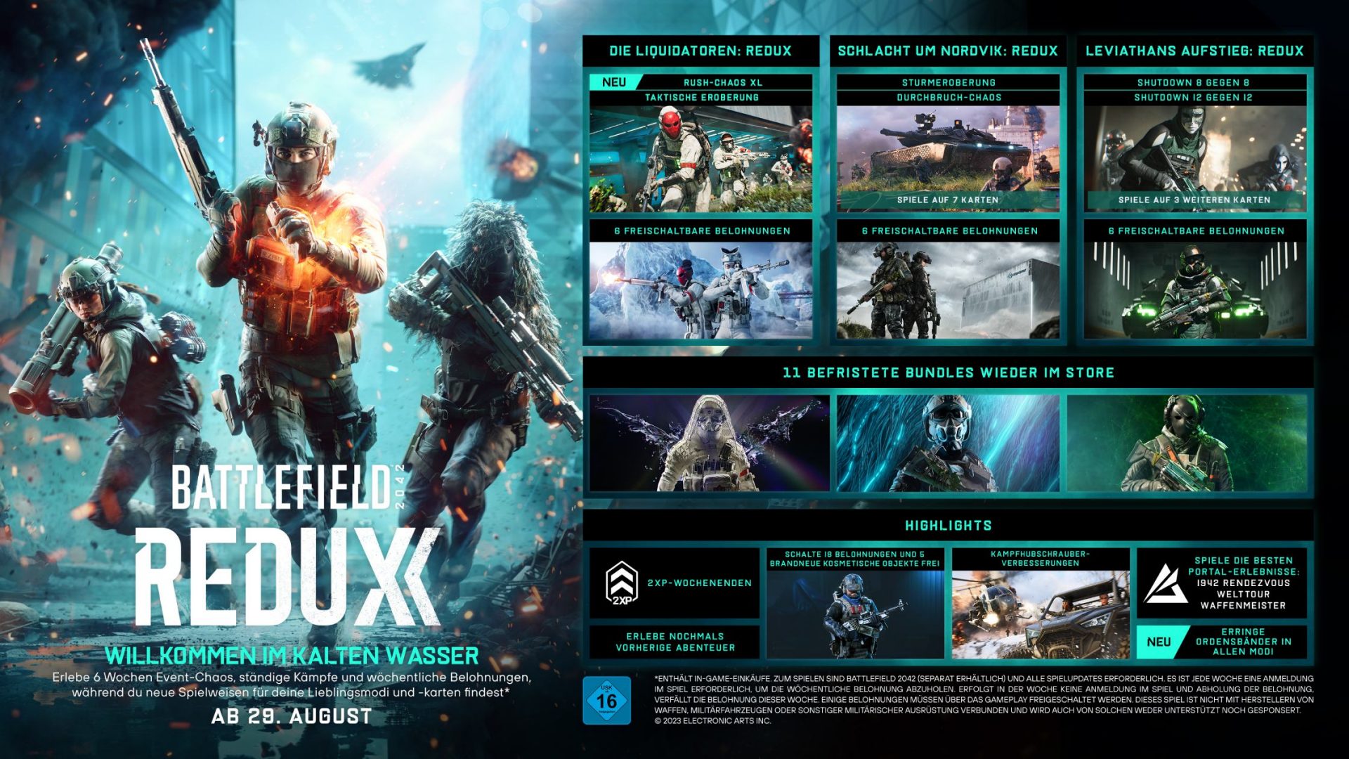 Im Rahmen von Redux wird eine breite Palette von Spielmodi angeboten werden, die jetzt auf mehr Karten und mit erweiterten Wettereffekten verfügbar sind. DICE hat dafür bereits einen Community-Kalender erstellt, um euch eine Übersicht zu geben.