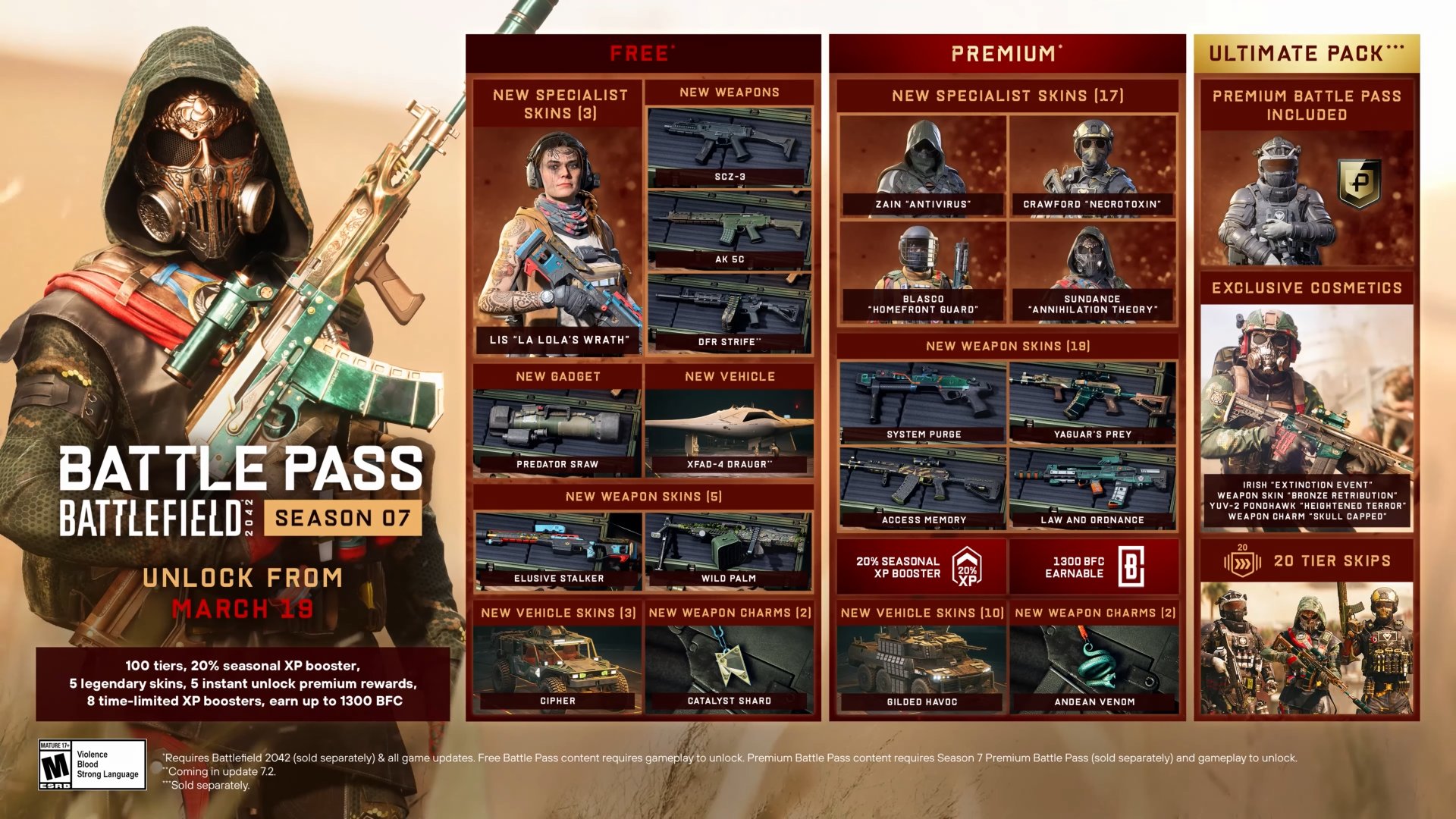 Mit zwei neuen Karten, einem neuen Fahrzeug, neuen Waffen, einem neuen Gadget und zahlreichen Gameplay-Verbesserungen bietet Season 7 die meisten neuen Inhalte innerhalb einer Season seit der Veröffentlichung von Battlefield 2042. Diese Kerninhalte werden allen Spielern im Rahmen der 30 kostenlosen Stufen des Season 7-Battle-Pass zur Verfügung stehen. Weitere kosmetische Objekte sind über die Premium-Version des Battle Passes erhältlich.