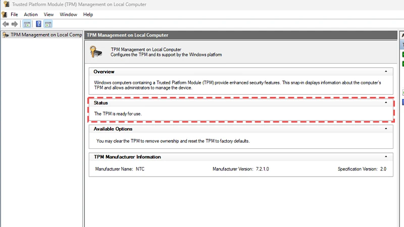 - Überprüfe das Status-Kästchen, um zu sehen, ob TPM zur Verfügung steht. Ist dies der Fall, solltest du überprüfen, ob dein Windows-Laufwerk MBR oder GPT ist.