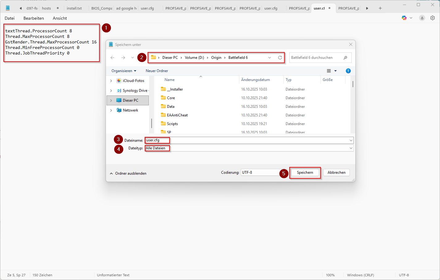 4. Speichere die Datei als User.cfg im Battlefield 6 Installationsverzeichnis. Achte darauf, als Dateityp „Alle Dateien“ auszuwählen, damit sie nicht als .txt endet.