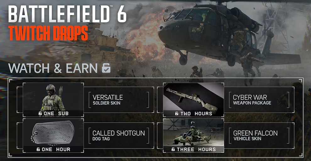 Passend zum Start von Battlefield 6 am 10. Oktober 2025 bietet Electronic Arts eine Twitch Drops Aktion an, die für Spieler exklusive kosmetische Belohnungen bereithält. Über eine Woche hinweg vom 10. bis 17. Oktober 2025 können Fans durch das Zuschauen von Battlefield 6 Streams auf Twitch und eine Verbindung ihrer EA- mit ihrer Twitch-Konten vier besondere Items freischalten.