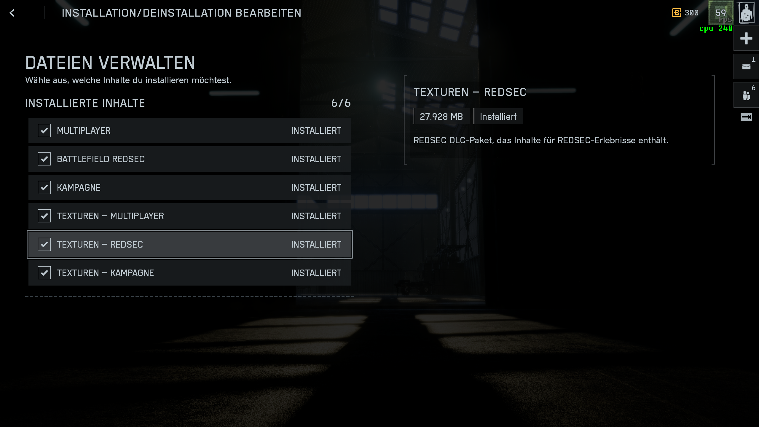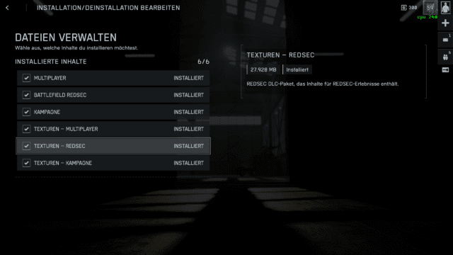 - Vergewissere dich, dass das RedSec-Modul heruntergeladen und installiert ist. Die Datenmenge liegt bei etwa 8,4 GB plus bis zu 28 GB für HD-Texturen auf dem PC.