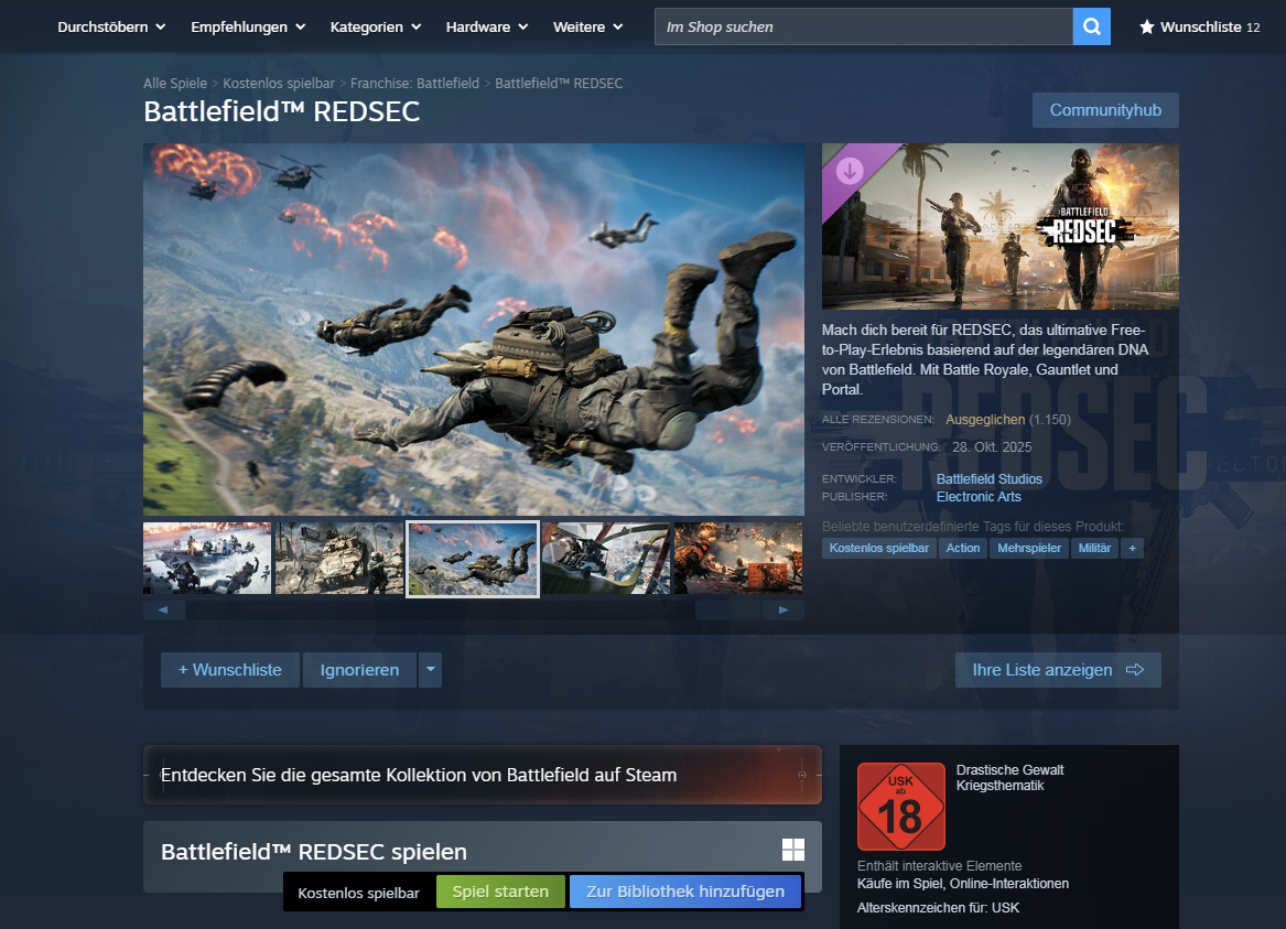 - Am Beispiel von Steam, kannst du nach Battlefield RedSec suchen und es in deiner Bibliothek hinzufügen, herunterladen und starten.