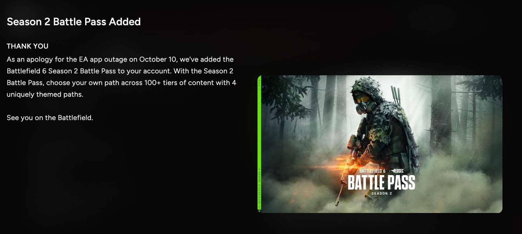 DICE verteilt aktuell den Battlefield 6 Season 2 Battle Pass an bestimmte Spieler, die Battlefield 6 über die EA App gekauft haben. Hintergrund ist der EA-App-Outage vom 10. Oktober 2026 zum Release von Battlefield 6, wir berichteten. Als Entschuldigung soll der Battle Pass nachträglich kostenlos gutgeschrieben werden.