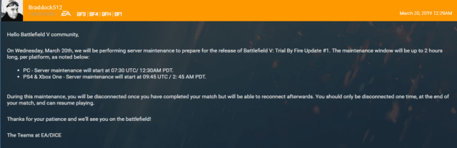Recht spontan und ohne viel Vorlauf hat DICE in den heutigen frühen Morgenstunden Wartungarbeiten am Battlefield V Backend vorgenommen. Die Wartungsarbeiten fanden statt, um Vorbereitungen für das seit gestern zertifizierte Trial By Fire Update #1, sprich das nächste Client Update für Battlefield V, vorzubereiten. Die Wartungsarbeiten fanden dabei für PC Spieler von 08:30 Uhr bis 10:30 Uhr deutscher Zeit statt und für Konsolen Spieler von 10:45 Uhr bis 12:45 Uhr.