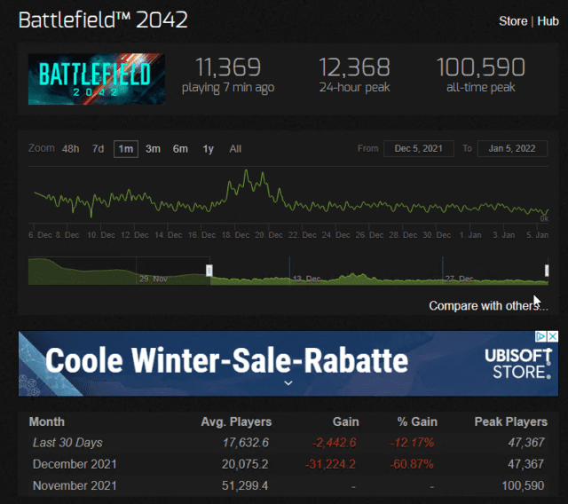Steam-Charts zeigen, dass die durchschnittliche Spielerzahl von Battlefield 2042 am 02. Januar 2022 kurzzeitig bei etwa 17.400 lag. Diese Zahl berücksichtigt die durchschnittliche Spielerzahl der letzten 30 Tage. Der 30 Tage Durchschnitt der auf Steam spielenden Spieler liegt aktuell bei etwa 17632 Spielern. Im November lag der Durchschnitt noch bei 51.300 Spielern und sank im Dezember auf 20.075 Spieler.