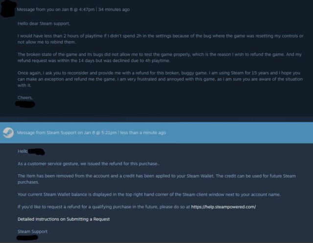 Normalerweise gibt es Richtlinien, die Spieler einhalten müssen, um eine Rückerstattung auf Steam zu erhalten. Beispielsweise müssen Sse das Spiel innerhalb von 14 Tagen nach der Anfrage gekauft und den Titel auch nicht länger als zwei Stunden gespielt haben.