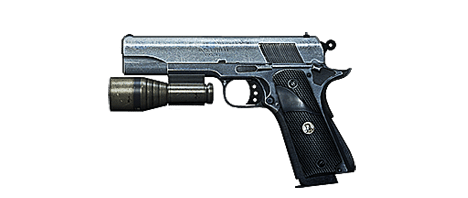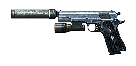 Die M1911 ist eine der beliebtesten Pistolen weltweit. 1911 fand sie ihren Einzug bei den US-amerikanischen Streitkräften und diente dort bis 1985 als primäre Seitenwaffe. Es existieren viele Klone und Kopien von der M1911, und ihr Mechanismus wird in nahezu allen modernen Pistolen verwendet. Modernisierte und überarbeitete Versionen der M1911 werden auch heute noch von den MEU(SOC) US Marine Corps Special Forces eingesetzt. Diese M1911 ist mit einer Lampe (Taclight) und einem Dämpfer ausgestattet.